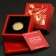 Verpackt wird diese Sonderausführung der Lunar III Goldmünzen in einer weinroten Verpackung, wo sie in einem schwarzen Bett mittig liegt. Der Deckel darüber ist mit einem kunstvollen Goldrand versehen, in dessen Mitte das Produkt nochmals mit seiner Serie betitelt wird. Die darüber liegende Kartonage wurde mit einem etwas helleren, aber ähnlichen Rotton versehen und zeigt darauf eine alternative Variante des Münzmotivs. Darin zu sehen ist ebenfalls ein Pferd auf einer Wiese vor Bergen, allerdings dieses Mal mit stilisiertem Strichmuster gezeichnet.